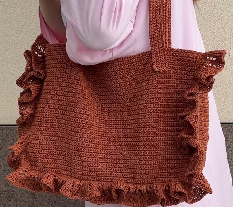 крючком. Каждая деталь обвязывается для удобства сшивания. Если вы вяжете из 100% льна, то на этом этапе нужно постирать все детали сумки. Если вы вяжете из рафии, каждую деталь нужно отпарить до сборки. Затем собираем все детали вместе. После полной сборки вяжем рюшу спицами, поднимая петли от основного